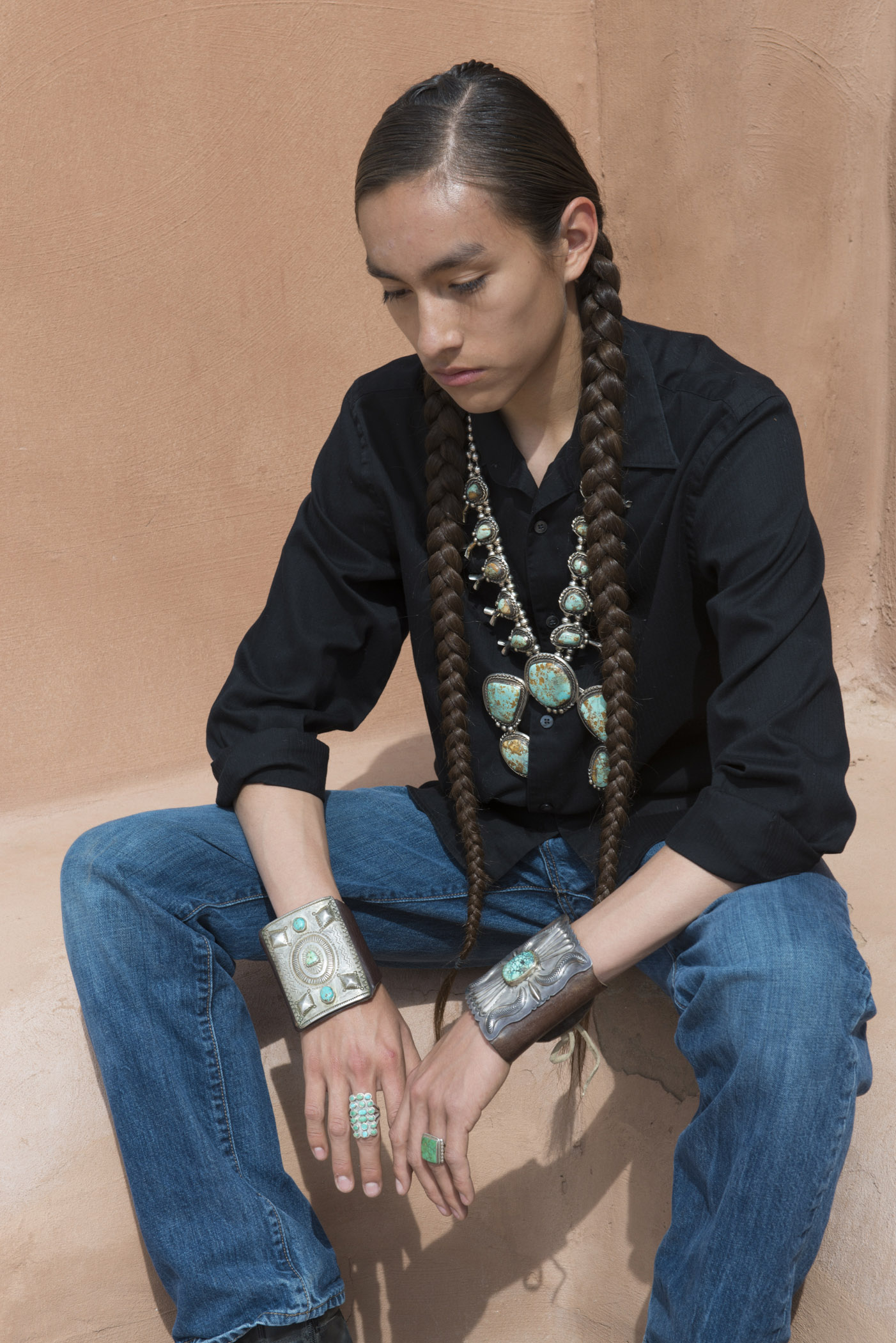 The squash blossom necklace is an iconic symbol of the Southwest, but the crescent and flowers began as Moorish symbols that were brought to the region by Spanish explorers and settlers. Navajo jewelers adopted the crescent, which they called a naja, and flowers (now squash blossoms instead of pomegranate flowers) and used them on necklaces. This necklace (Cat # 56966/12, 15” by 10.5”) is Navajo in origin. One ketoh, or bow guard, is Navajo (Cat # 10687/12), while the other was made by Santo Domino Pueblo artist Luther Aguilar in 1952 (Cat # 36139/12). Both are about four inches long and made of silver, turquoise, and leather. The rings are Navajo (Cat # 36078/12, made by Tom Morris, and 10514/12) and made of turquoise and silver.