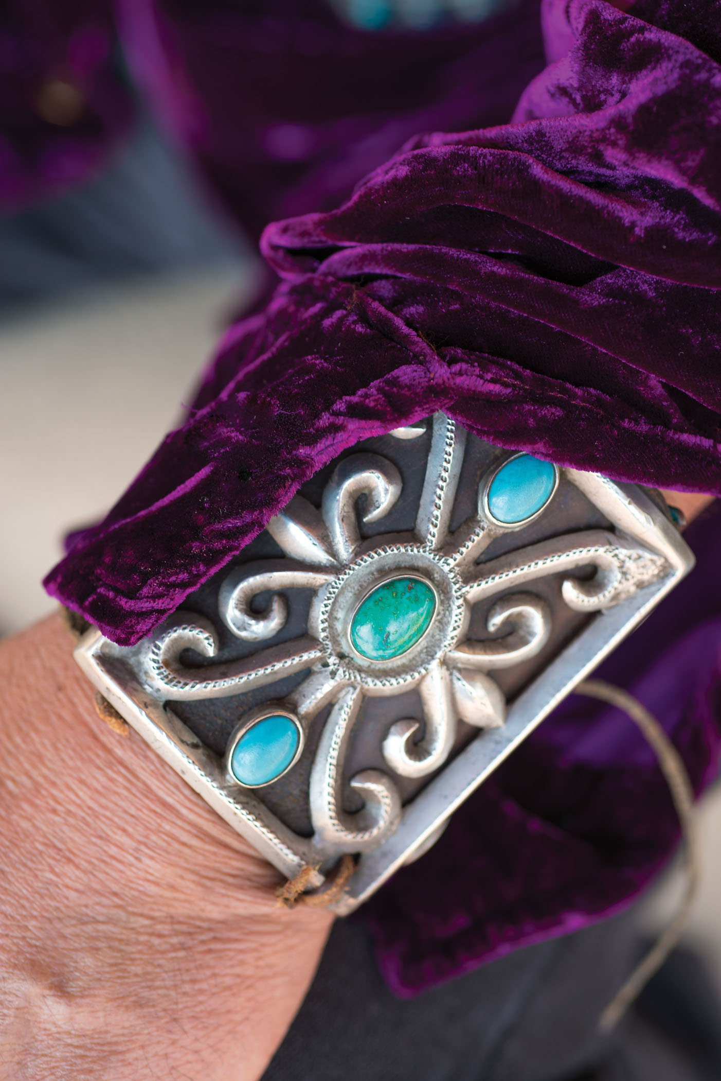 Ketohs, or bow guards, were traditionally worn to protect an archer’s arm from the sting of a released bowstring; today, they are worn as decoration. This ketoh (circa 1912) pairs two glass cabochons with one of real turquoise. So-called Hubbell glass was imported into the region during a period when turquoise was difficult to acquire. Artists used it because it had the right color, but tourists rejected it as “fake.” (Courtesy of the Museum of Indian Arts and Culture/Laboratory of Anthropology. Photograph by Kitty Leaken.)