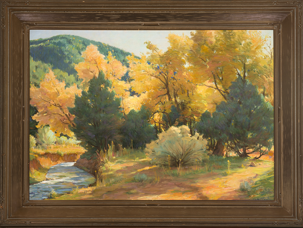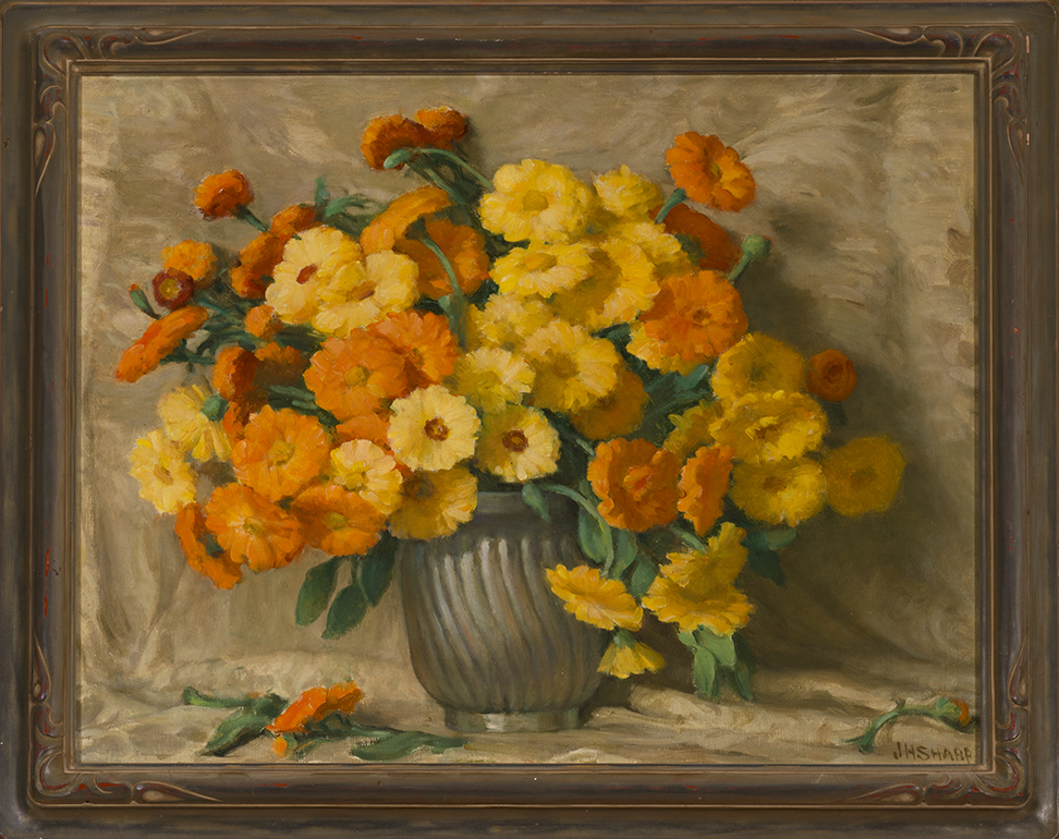 Joseph Henry Sharp (Sept. 27, 1859 – Aug. 29, 1953) was one of the earliest European-American artists to visit Taos, New Mexico, which he saw in 1893. During his long and prolific career as a painter, Sharp was best known for his realistic portrayal of Native Americans., and a significant body of work of still life. The three donated Sharp paintings (featured above left to right) are all circa 1935: Flowers on Rio Grande Blanket, Taos Cañon and Marigold-Calendula.
