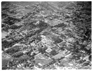 Even in 1929, Santa Fe was an art center, the state capital, and a historic community. It was still a town rather than a city, however, and agricultural fields can be seen not far from the Plaza (approximately at the center of the photo), the heart of the social and economic life of the town. The old capitol building can be seen surrounded by trees in the upper center. Trees also mark the Santa Fe River, which forms a wandering diagonal from lower left to upper right. North is to the right in this photograph. Photograph by Charles A. and Anne Morrow Lindbergh, 1929.