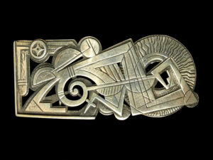 Belt Buckle by Michael Kabotie, ca. 2003. Sterling silver. Collection of Dr. Gregory and Angie Yen Schaaf. Photo by Ricardo Martinez.